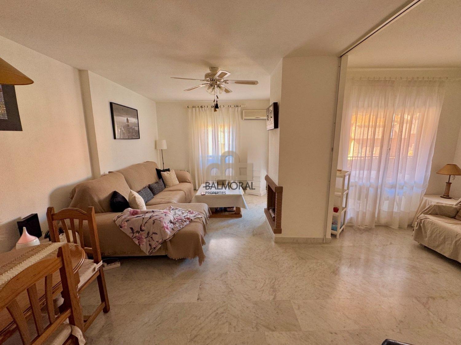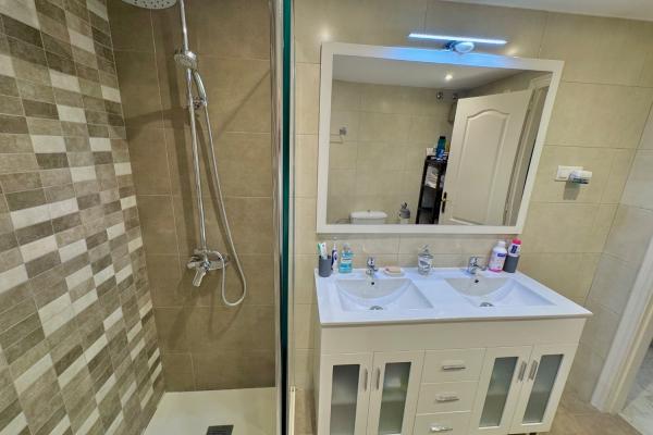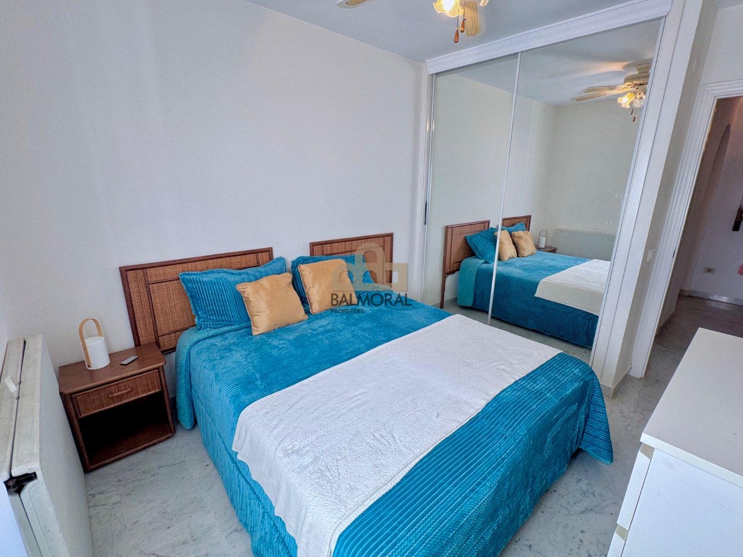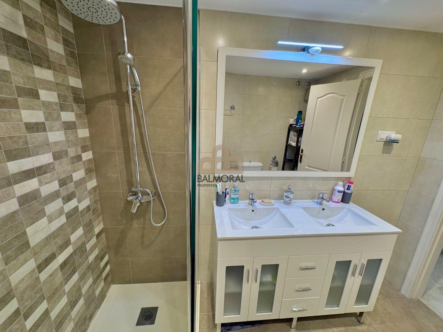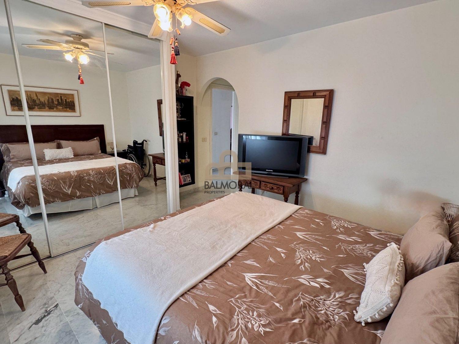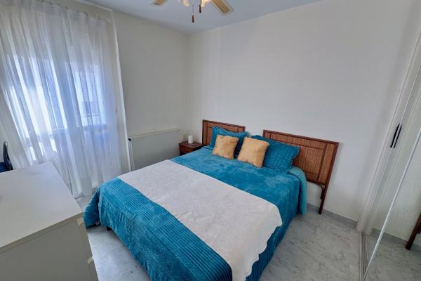 El piso cuenta con tres dormitorios, uno de ellos ingeniosamente integrado al salón mediante un biombo, lo que proporciona un espacio versátil y acogedor. Además, dispone de dos baños completos, ideales para mayor comodidad. Los armarios empotrados ofrecen un amplio espacio de almacenamiento, manteniendo todo ordenado y al alcance.